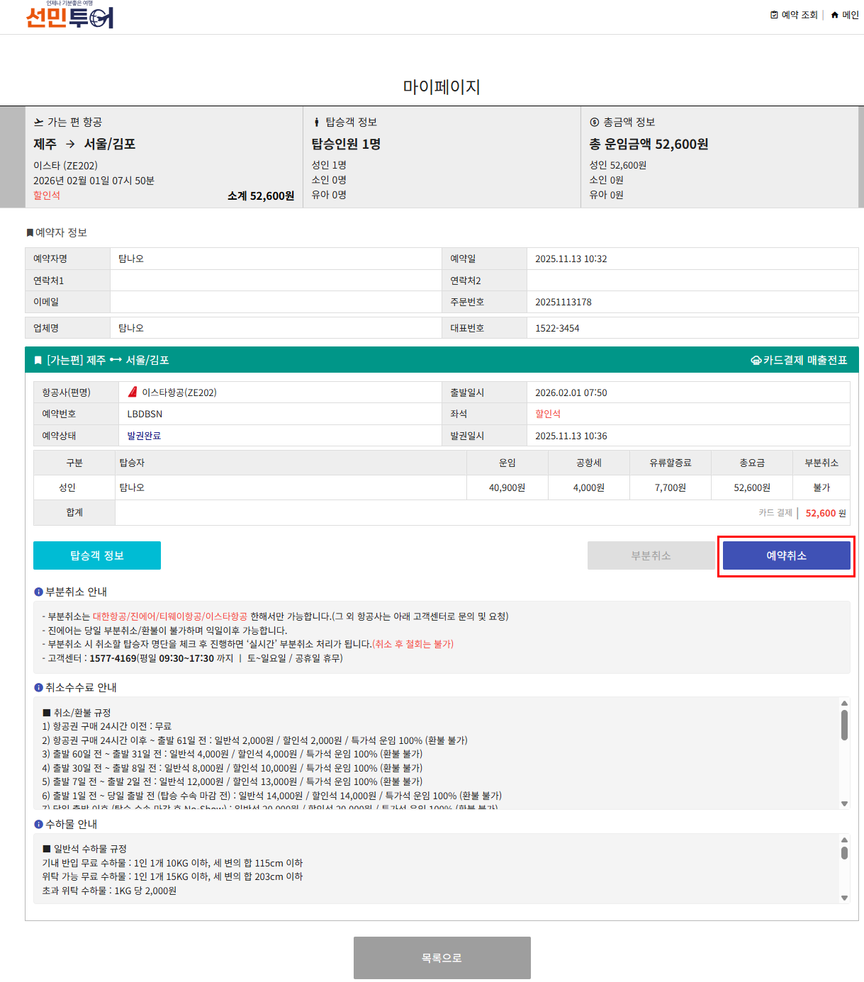 *항공권 구매 당일(예약시점 ~24시이전 취소)시 수수료는 무료입니다.